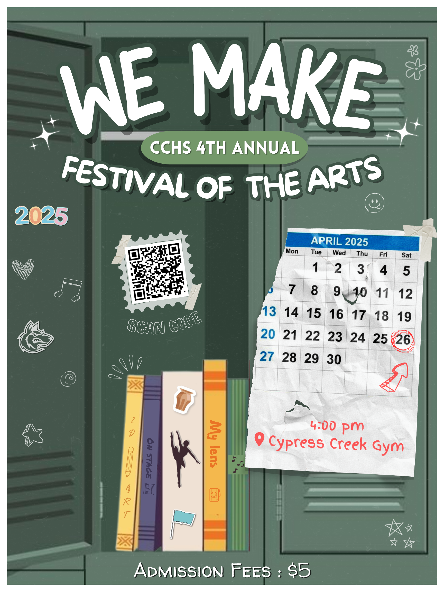 Each year the Conservatory of the Arts celebrates each facet of our conservatory at the Festival of the Arts–we take over the CCHS campus to showcase multimedia 2D & 3D artwork, dance, color guard, music, and theater. The juried art competition takes center stage to close the night.
